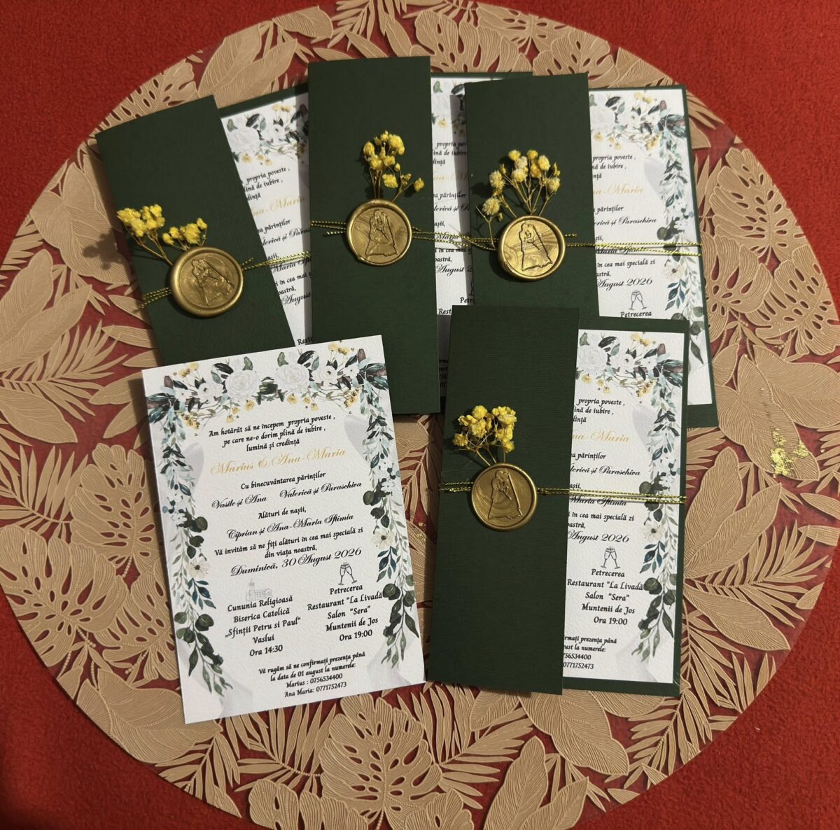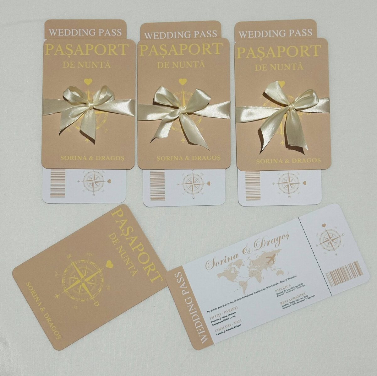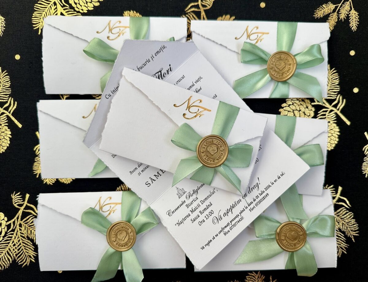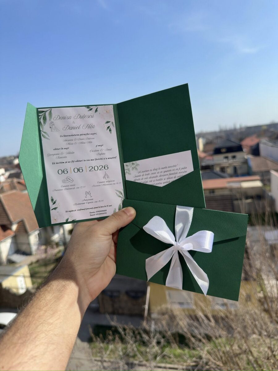 Designul elegant este completat de o fundă fină, care adaugă un accent festiv și transformă invitația într-un obiect plăcut la vedere și la atingere, ușor de oferit și de păstrat ca amintire.