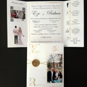 Invitație regală cu un design aparte, realizată în format tip poartă, cu deschidere dublă în stil ușă, ideală pentru evenimente elegante și pline de semnificație. Este închisă cu un sigiliu cerat sau un șnur auriu delicat, oferind un aspect rafinat și unic.