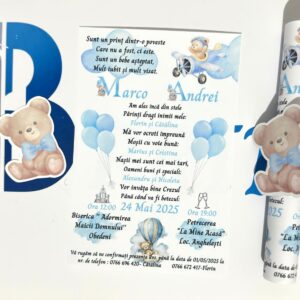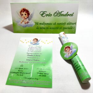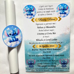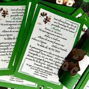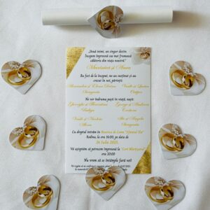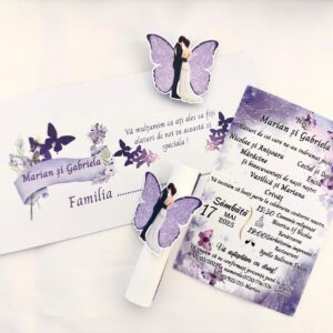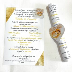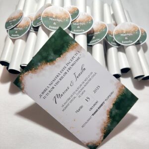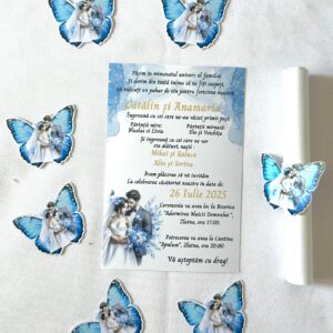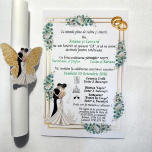 Realizate pe carton de calitate, aceste invitații se remarcă prin prezentarea originală și rafinată. Pot fi personalizate integral cu textul dorit, numele sărbătoriților, data evenimentului și elemente grafice specifice temei tale.