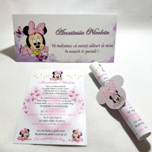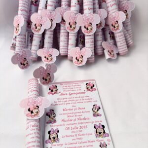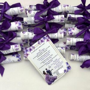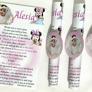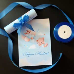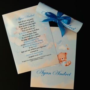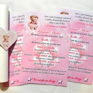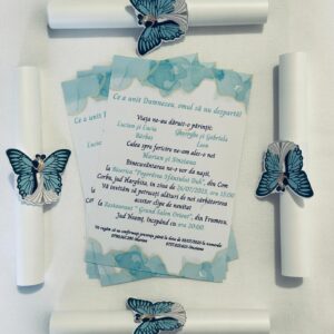 Invitații rulate elegante, disponibile în formatele 10×15 cm, 13×18 cm și 15×21 cm, legate cu fundă, șnur sau panglică, ideale pentru nuntă, botez sau orice eveniment special.