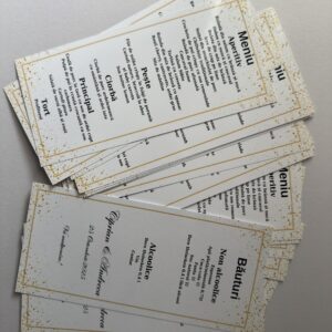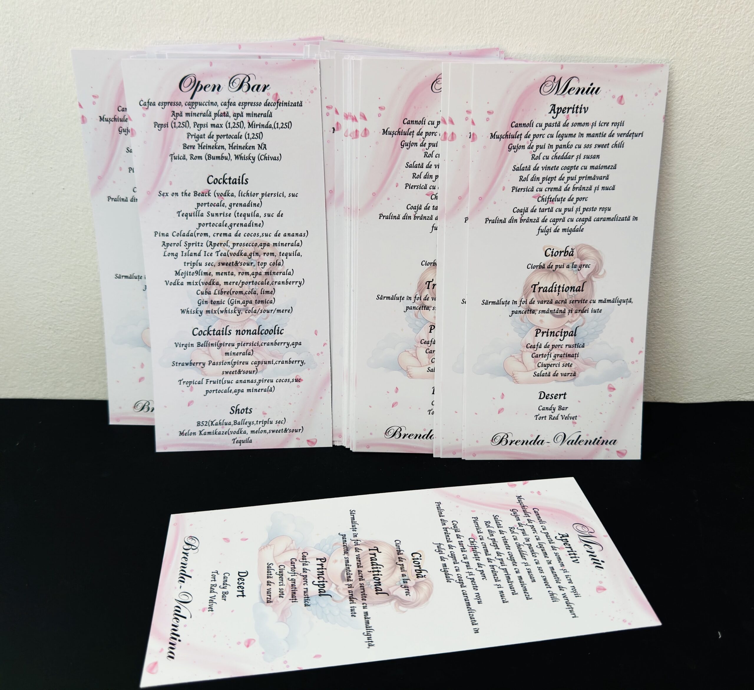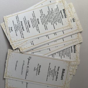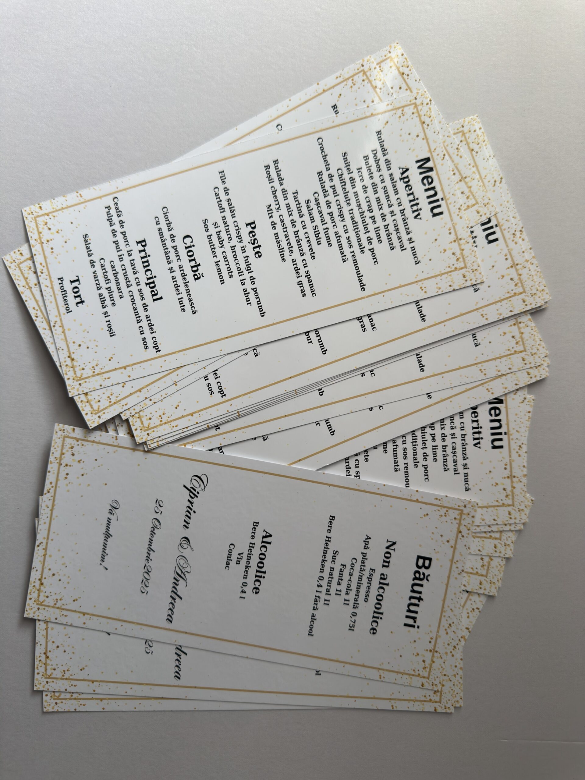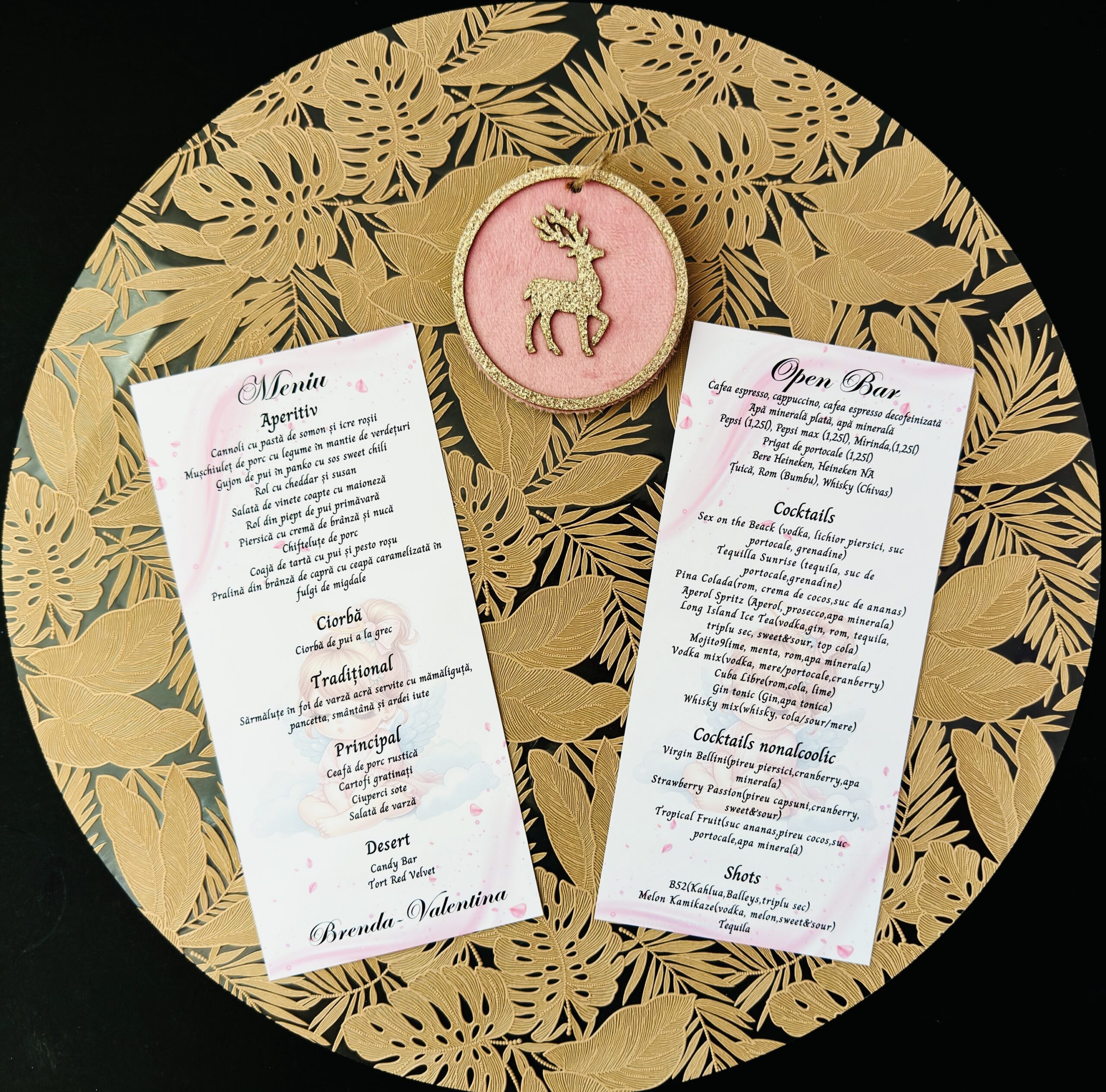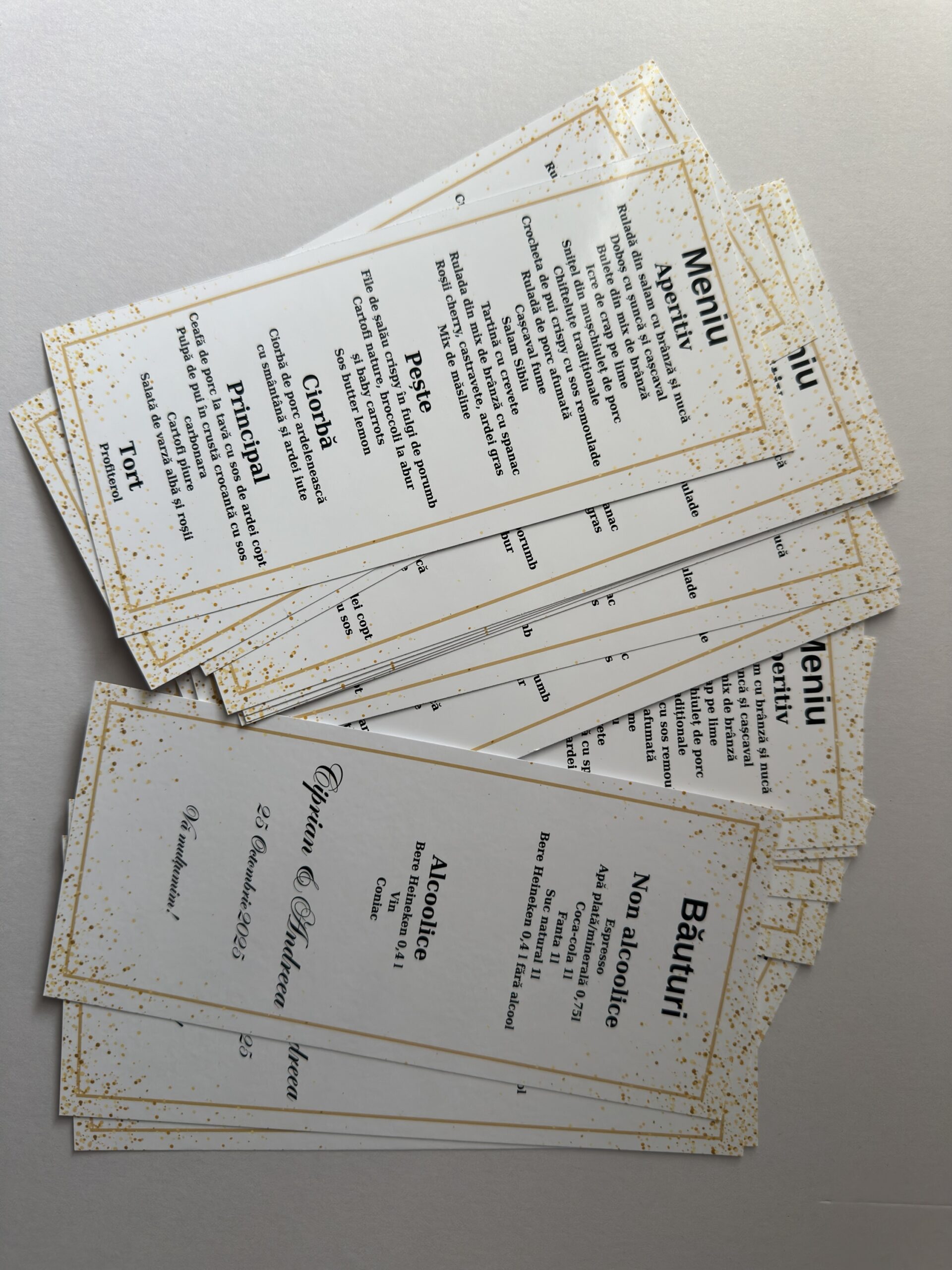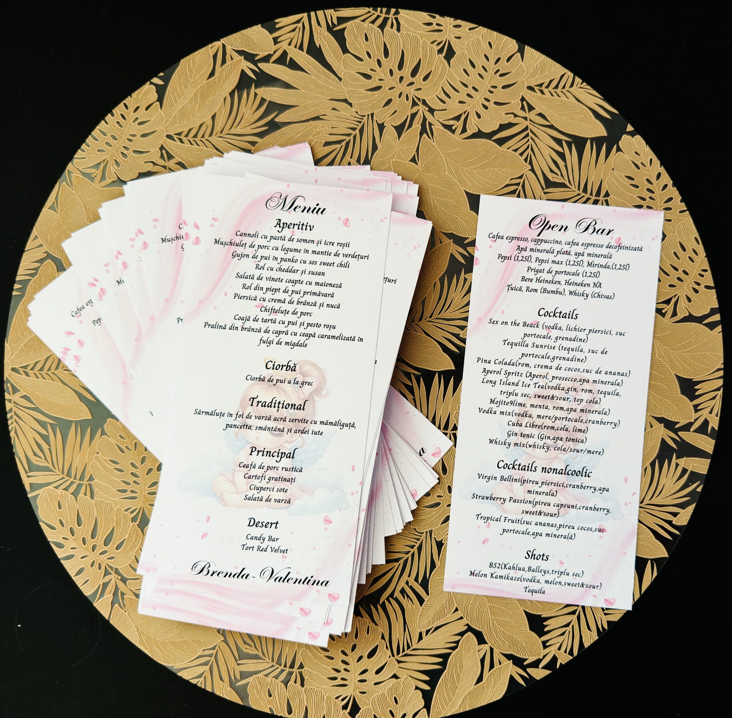 Un detaliu rafinat care completează perfect decorul mesei. Meniul este realizat pe hârtie lucioasă premium de 180 g, suficient de rigidă pentru un aspect elegant, dar în același timp fină la atingere.