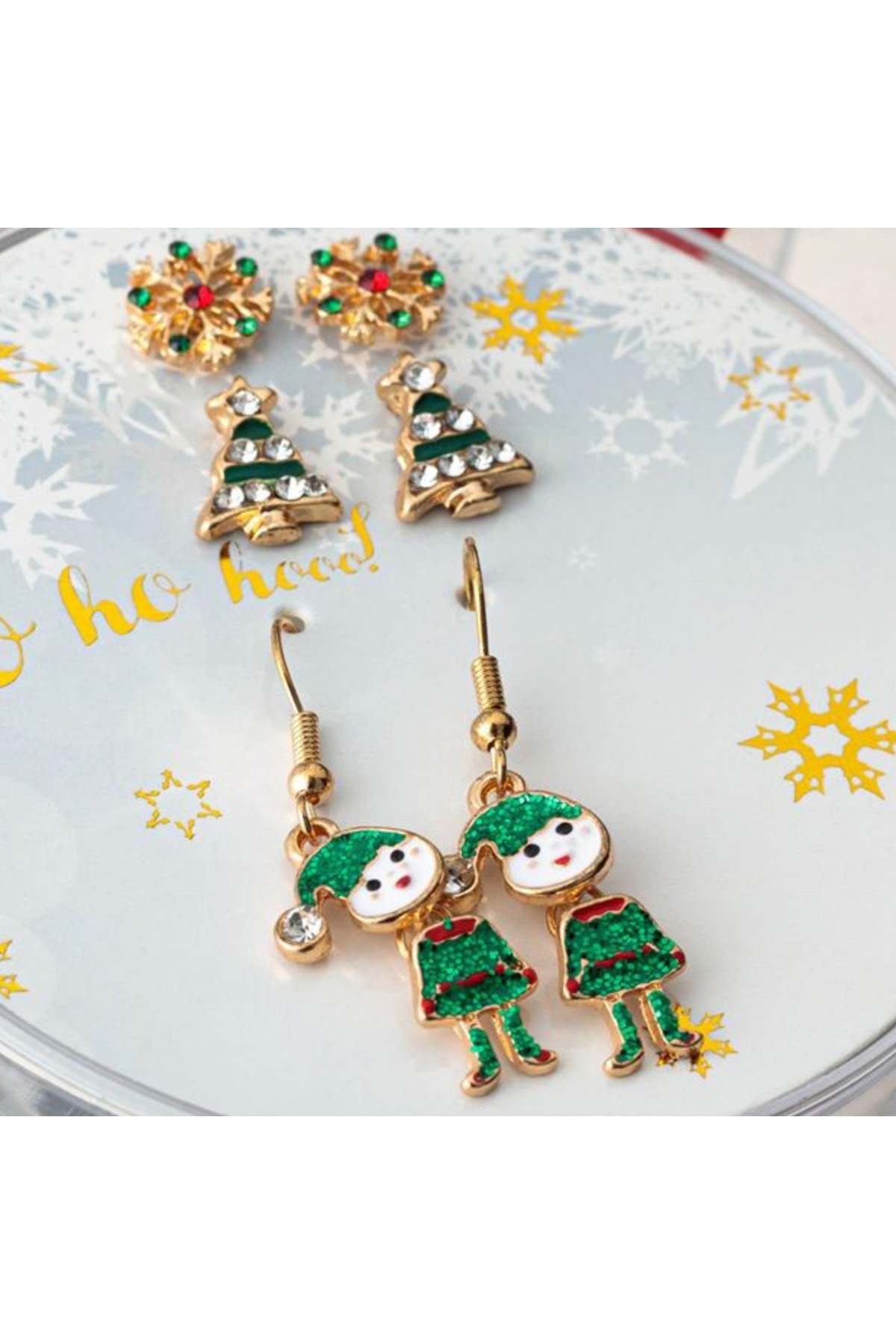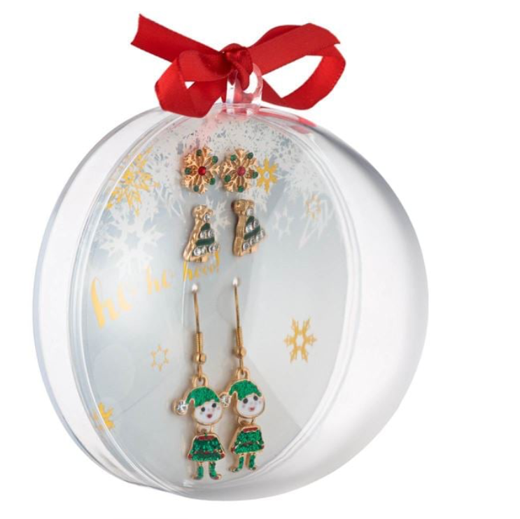 Ideal pentru a aduce un zâmbet pe chipurile celor dragi!🎁 Perfect pentru un cadou de Crăciun pentru cei dragi!Detalii produs:Set: 3 perechi de cerceiMaterial: Metal aurii cu pietre colorateDesign: Fulg de zăpadă, brad, spiriduși suspendați într-un glob din plastic transparent cu panglică roșieDimensiuni ambalaj: 8,3 × 6 cm