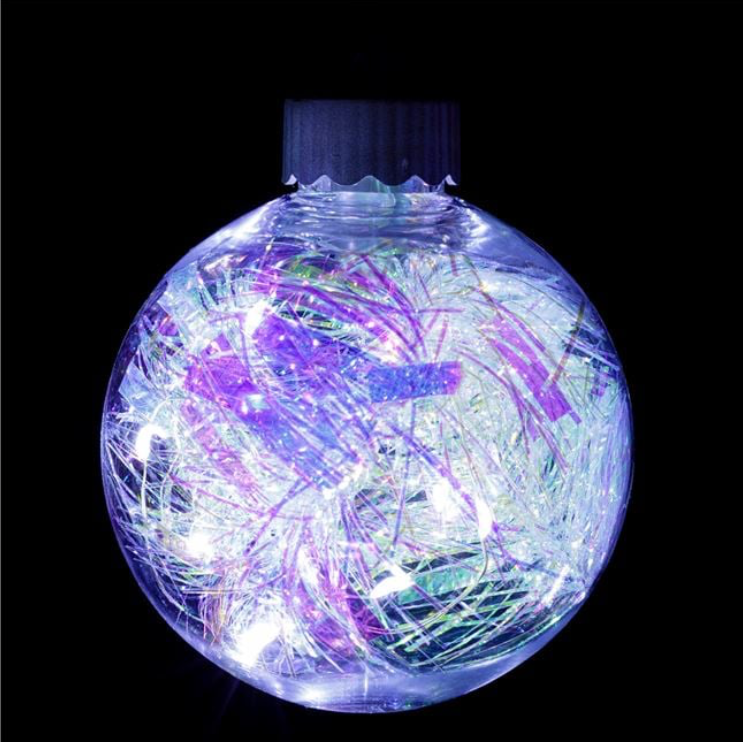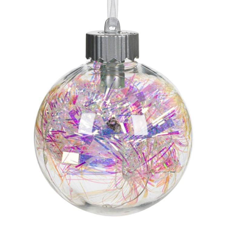 Adaugă o notă de strălucire modernă bradului tău cu globul de Crăciun transparent cu tinsel irizat și LED integrat. Cu un diametru de 9 cm, acest glob elegant oferă o luminozitate caldă și subtilă, perfectă pentru a crea o atmosferă magică de sărbători. Designul transparent cu accente irizate reflectă lumina în mod spectaculos, aducând farmec și rafinament decorului tău de Crăciun.