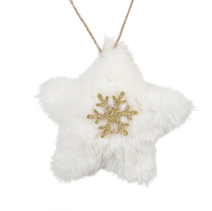 daugă un strop de eleganță bradului tău cu acest ornament de Crăciun în formă de stea albă din blană moale, decorată cu fulg cu glitter auriu. Realizat din poliester de calitate, acest ornament rafinat se integrează perfect în orice decor festiv, oferind un aspect cald și strălucitor. Combinați diferite culori, modele și dimensiuni pentru a crea o atmosferă unică de Crăciun.