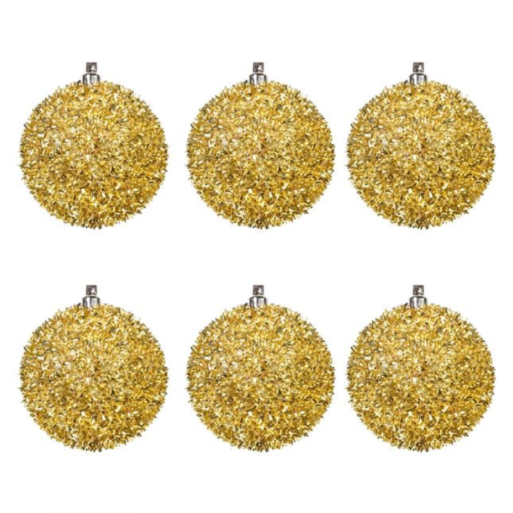 Îmbogățește decorul bradului tău cu acest set de 6 globuri de Crăciun aurii cu tinsel, perfecte pentru a adăuga strălucire și eleganță festivă. Fiecare glob are un diametru de 8 cm, fiind ideal pentru combinarea cu alte ornamente și crearea unui brad armonios și sofisticat. Tinsel-ul integrat reflectă lumina, oferind un efect sclipitor și festiv în întreaga încăpere.